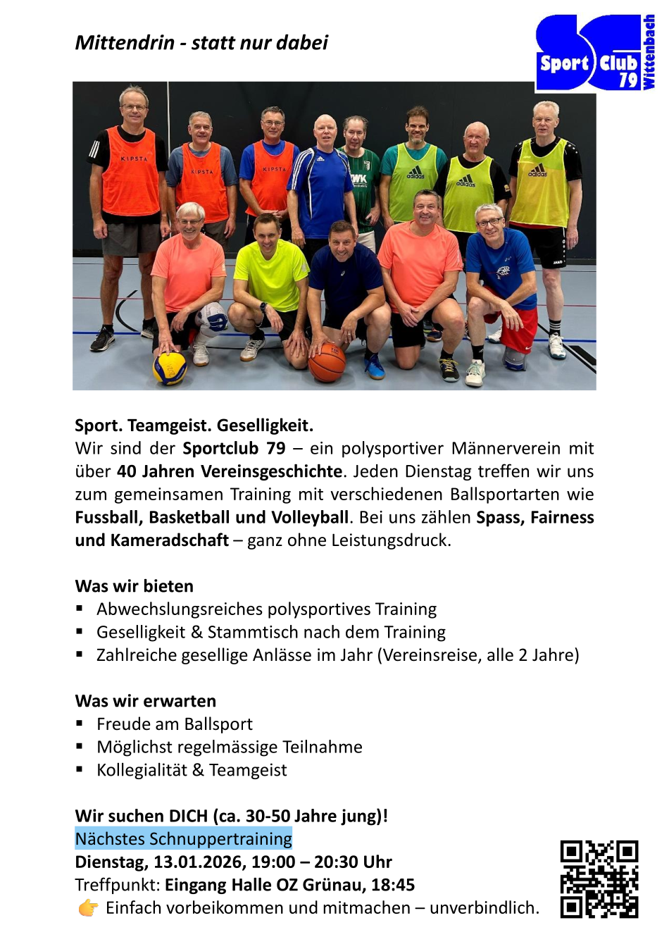 Werde Teil unseres Wittenbacher Traditionsvereins und erlebe mit uns unvergessliche Momente auf und neben dem Spielfeld. Schliesse dich dem SportClub 79 an und lasst uns gemeinsam fit, fair und fröhlich sein!